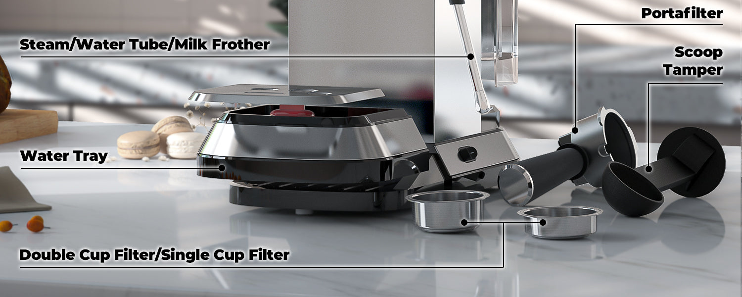Best Home Coffee Machine for Espresso & Latte Lovers: Everything you need for a professional coffee experience at home is included. The package comes with the stainless steel coffee maker, a sturdy portafilter, both single cup and double cup filters, a tamper for precise coffee puck preparation, and a large 1.5L removable water tank for multiple servings without constant refilling. With this all-in-one setup, you can start brewing like a pro from day one. With this easily operated classic espresso machine at home, you could be able to brew your own cuppa at lower cost and without leaving the comfort of your kitchen, as well as the benefits to the environment since you won't be consuming any takeaway cups.