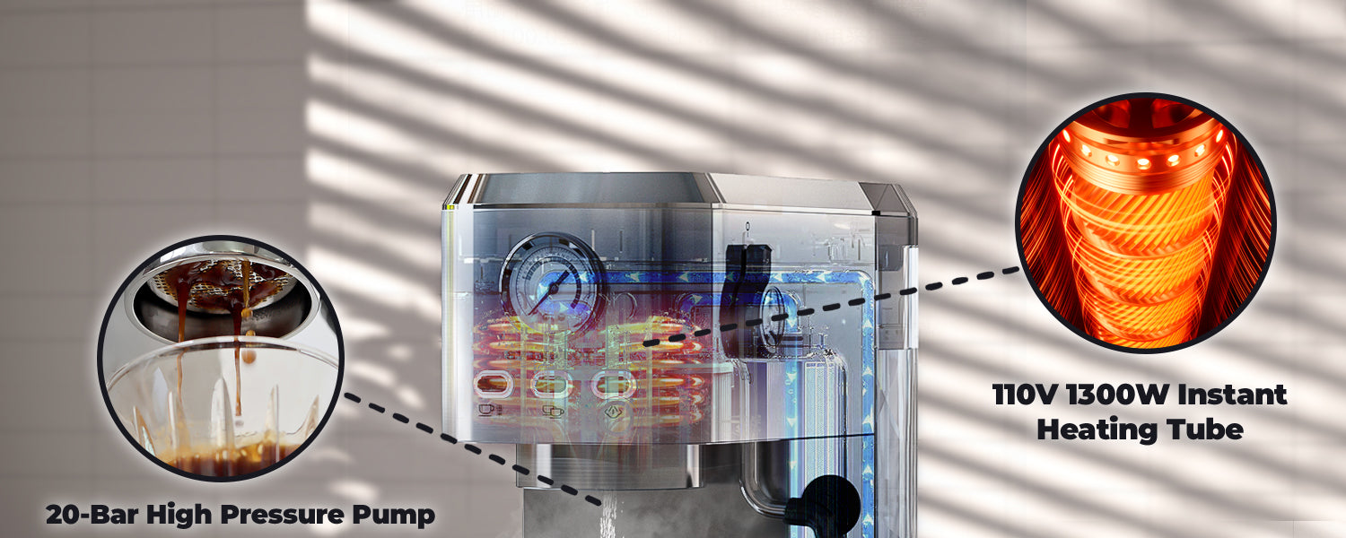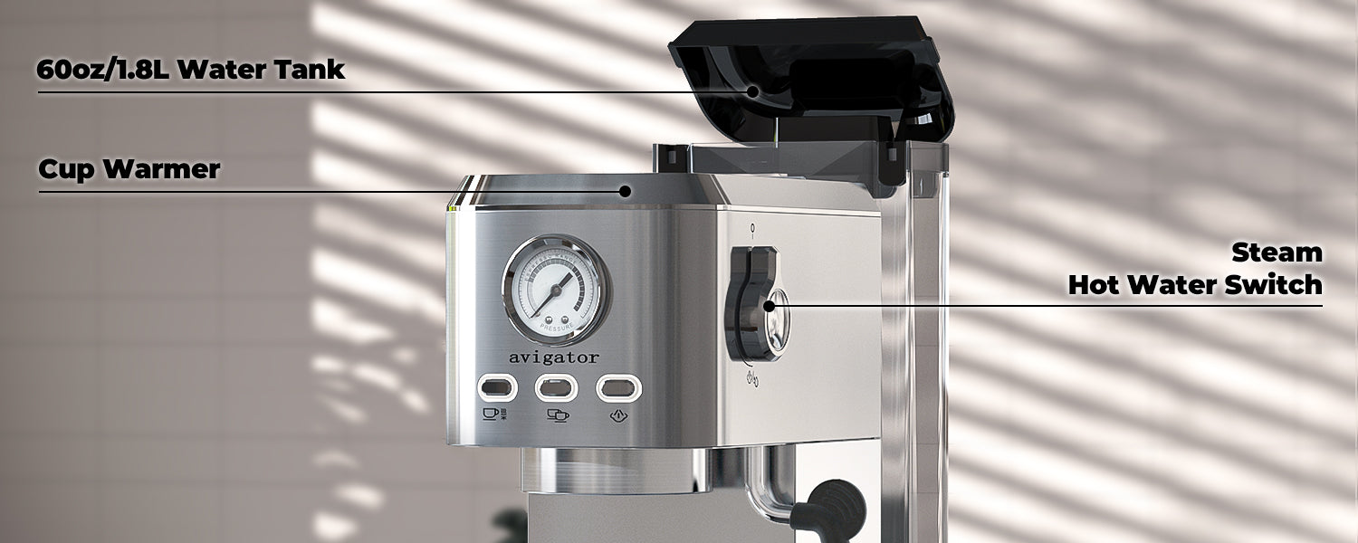 20 Bar Pressure System: The Avigator Semi-Automatic Espresso Machine for home features a powerful professional-grade 20 bar pump, delivering optimal water pressure to extract maximum flavor from your coffee grounds. This high-pressure system ensures you get a shot topped with a thick, golden crema, giving your coffee a velvety texture and a robust, irresistible aroma. Whether you’re a beginner or an experienced home barista, the 20 bar pressure makes pulling a perfect shot effortless, helping you achieve coffee-shop results without leaving your home.